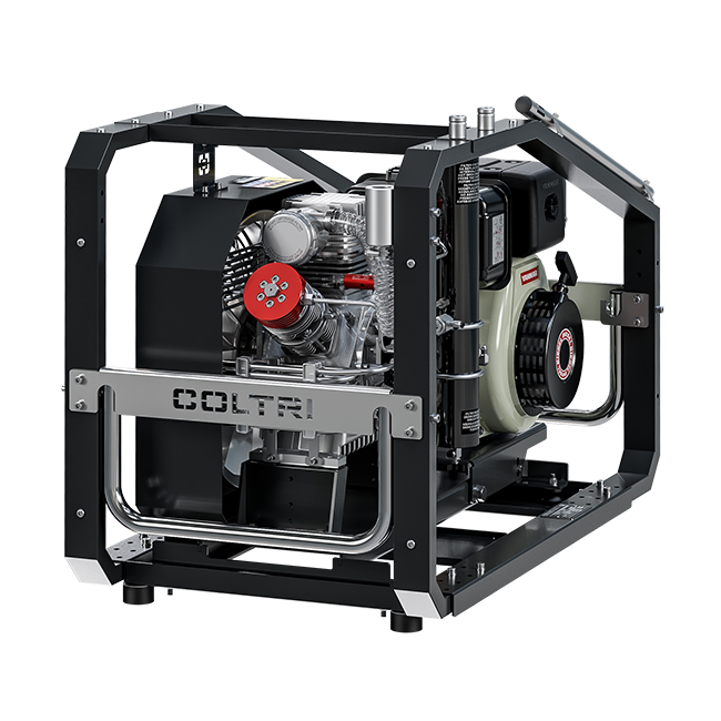 Компрессор для дайвинга Coltri Sub MCH-16 Ergo Diesel. Компрессор приводится в действие с помощью дизельного двигателя и обеспечивает производительность в 285 литров в минуту. Два зарядных устройства со сбросом давления обеспечивают при необходимости бесперебойное наполнение баллонов.