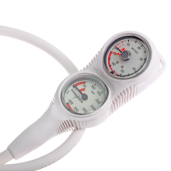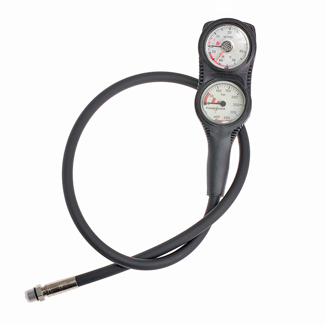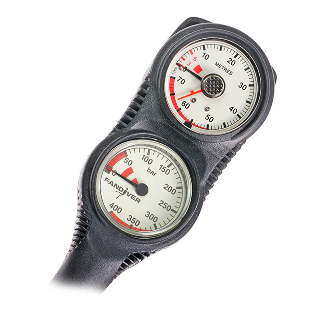 Консоль для дайвинга 2-х приборная FanDiver Compact. Включает в себя два аналоговых прибора: манометр, с измерительной шкалой до 400 Бар и глубиномер, размеченный до 70 метров. Манометр адаптирован для использования как с 200-т, так и 300-т барной аппаратурой. Шкалы приборов флуоресцентные, что значительно облегчает считывание информации в условиях плохой видимости. Консоль имеет индикатор максимальной глубины. Компактная и легкая двухприборная консоль.