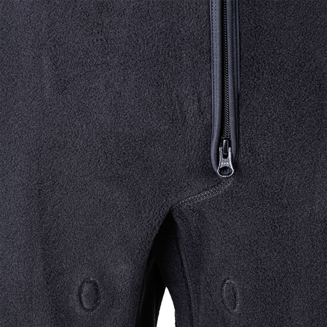 Передняя молния смещена на шее, чтобы избежать пережатия шейной манжетой. Низкий профиль и петли, для удобного одевания. Карман на молнии для ключей. Сшита одной частью для удобства одевания.